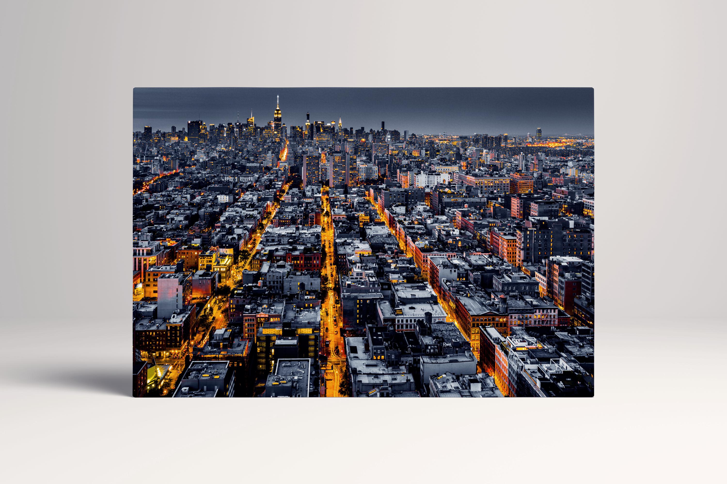 Experience the electric urban glow with this City Lights Aerial NYC Night wall art printed on premium PETA approved faux leather canvas with vibrant contrast and vivid detail. Gallery wrap finish creates clean, modern edges. Available as single panel, 3 panel triptych, or 5 panel layout — ideal for living rooms, bedrooms, offices, and metropolitan interiors that celebrate city energy.