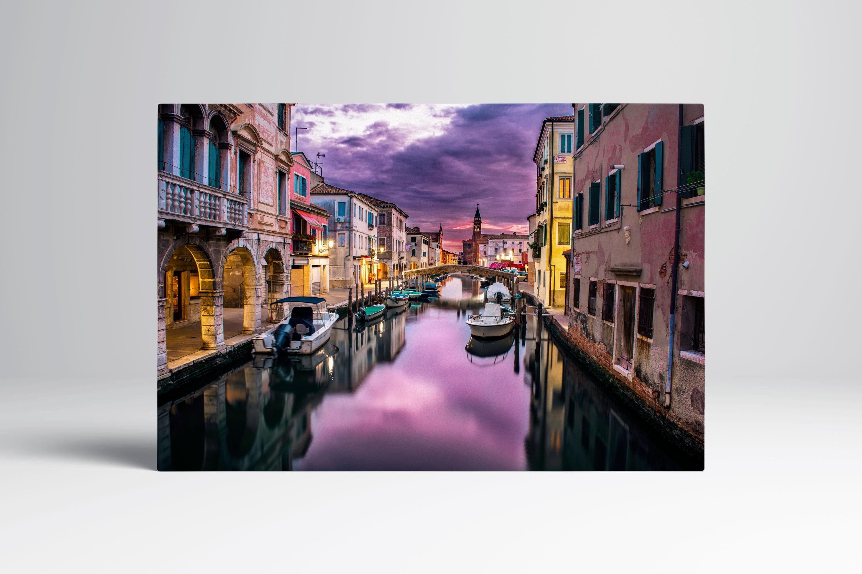 Capture the timeless elegance of Venice with Grand Canal at Dawn, a scenic wall art printed on PETA approved vegan eco leather. Soft morning light reflects on the water, highlighting historic architecture and creating a refined, atmospheric focal point for living rooms, bedrooms, offices, or sophisticated interiors. Available as gallery wrap wall art in single, three, or five panel layouts, designed to elevate both classic and modern spaces.