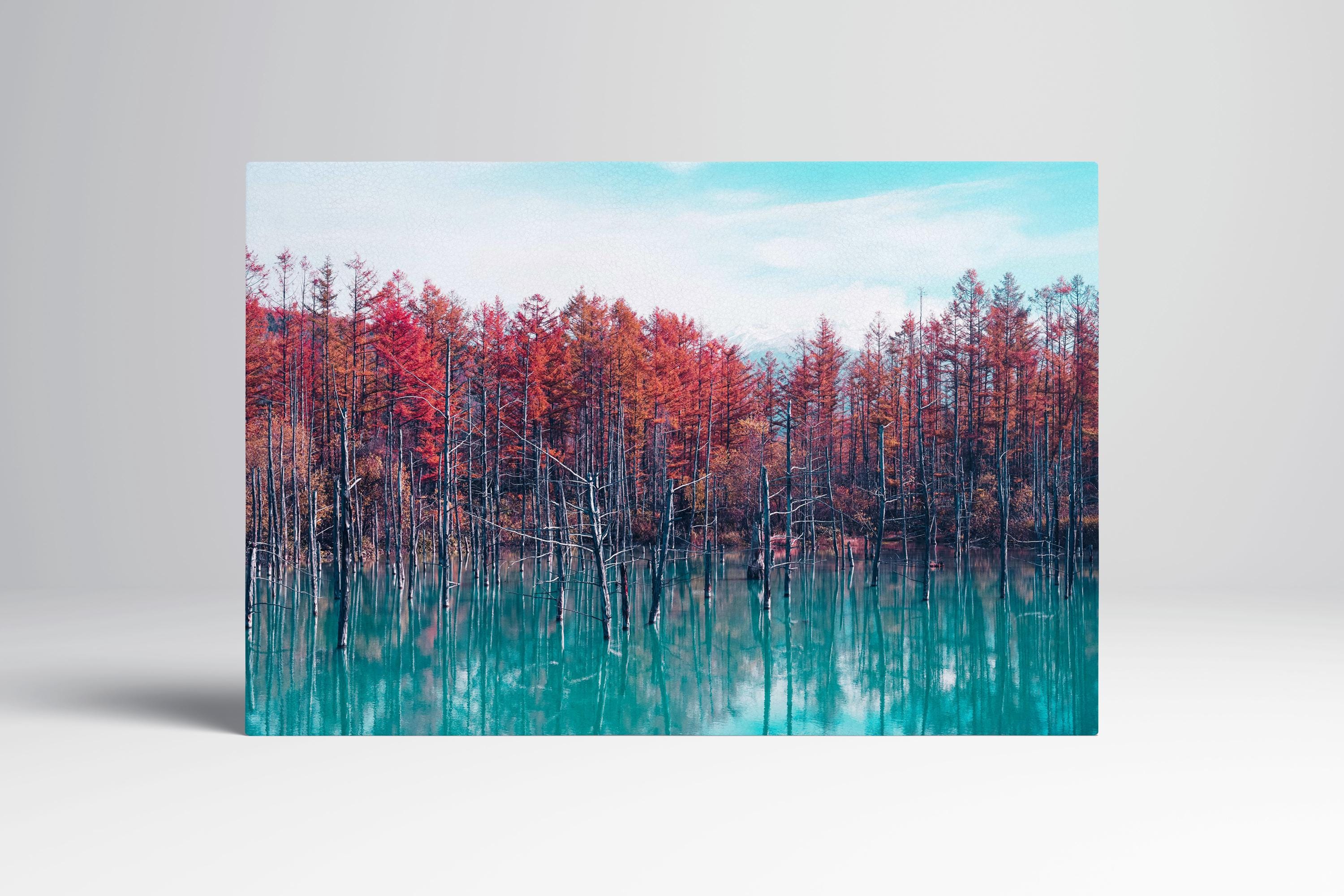Red Trees Blue Pond Reflection Hokkaido Japan Eco Leather Wall Art Frame