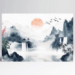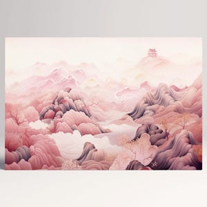 This exquisite artwork captures the beauty of cherry blossoms in their prime, set against a backdrop of misty mountains. The delicate pink petals of the blossoms create a striking contrast against the soft grey tones of the mountains, evoking feelings of renewal and tranquility. The detailed watercolor design brings a sense of fluidity and elegance, making it a perfect addition to any room that seeks a touch of nature and serenity.