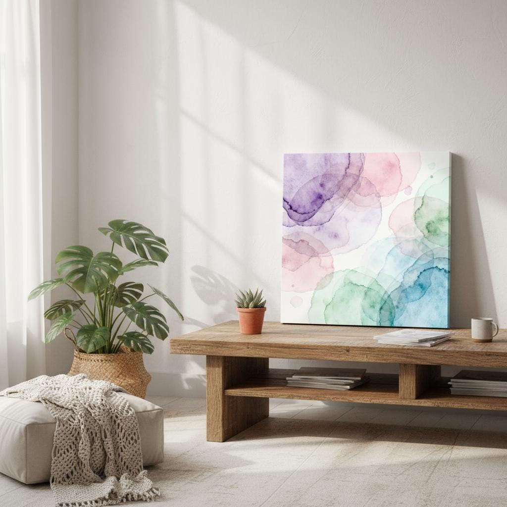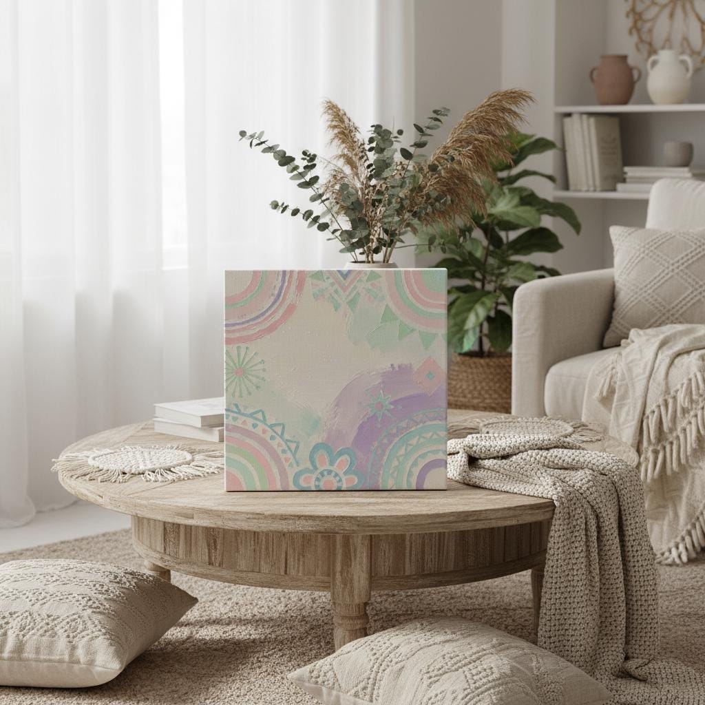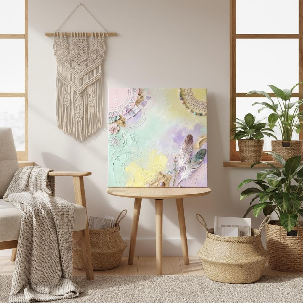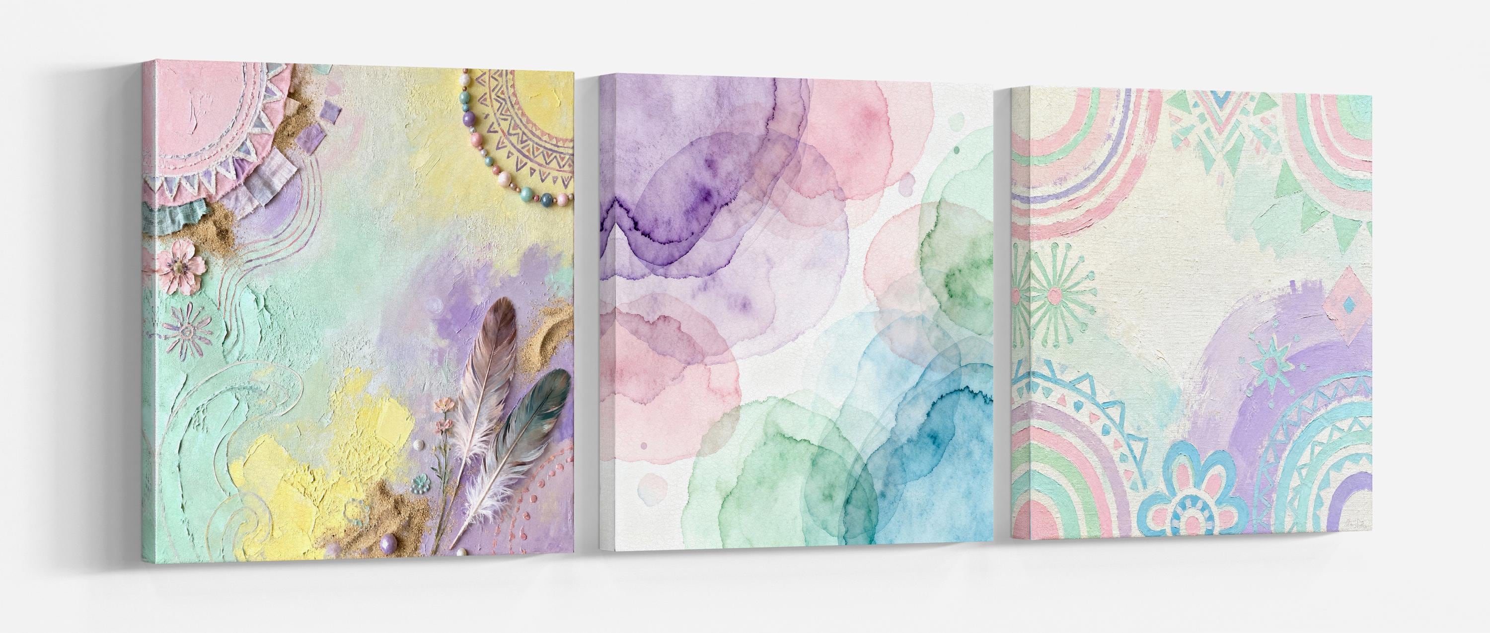 This triptych canvas set features delicate pastel tones and abstract bohemian motifs, blending watercolor textures and subtle mandala details for an uplifting, dreamy effect. Printed on eco leather, it's perfect for modern and cozy interiors, offering a unique fusion of contemporary art and natural inspirations. Available as a triptych or single panel, it brings soft, artistic warmth to any space.