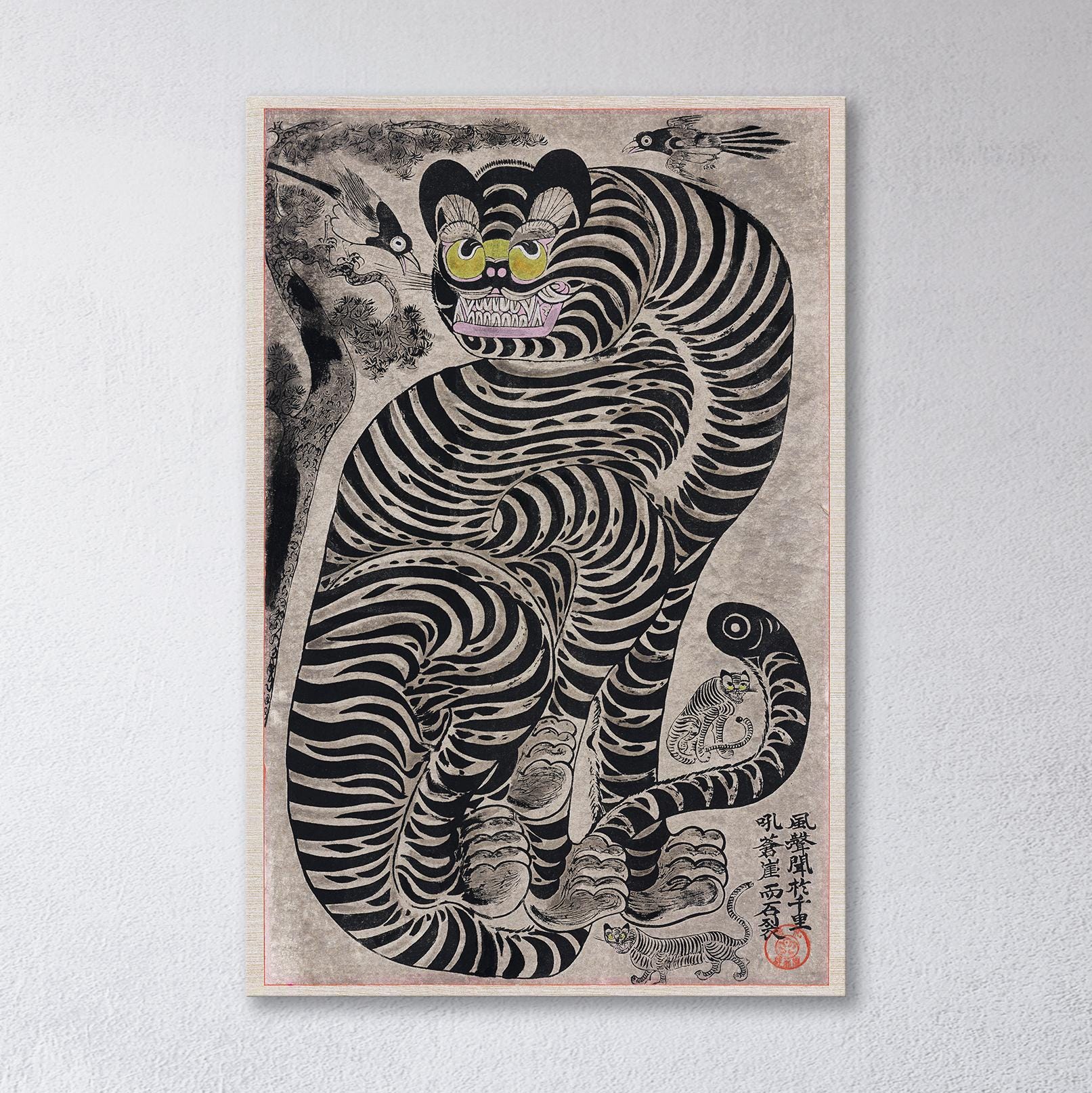 Vintage 20th-century Japanese talismanic tiger painting featuring a fierce striped beast with yellow glasses, grinning fangs, and bold ink brushwork on premium eco leather canvas. This protective folk art embodies mythical power and cultural symbolism, perfect for striking decor in homes, offices, or zen-inspired spaces.