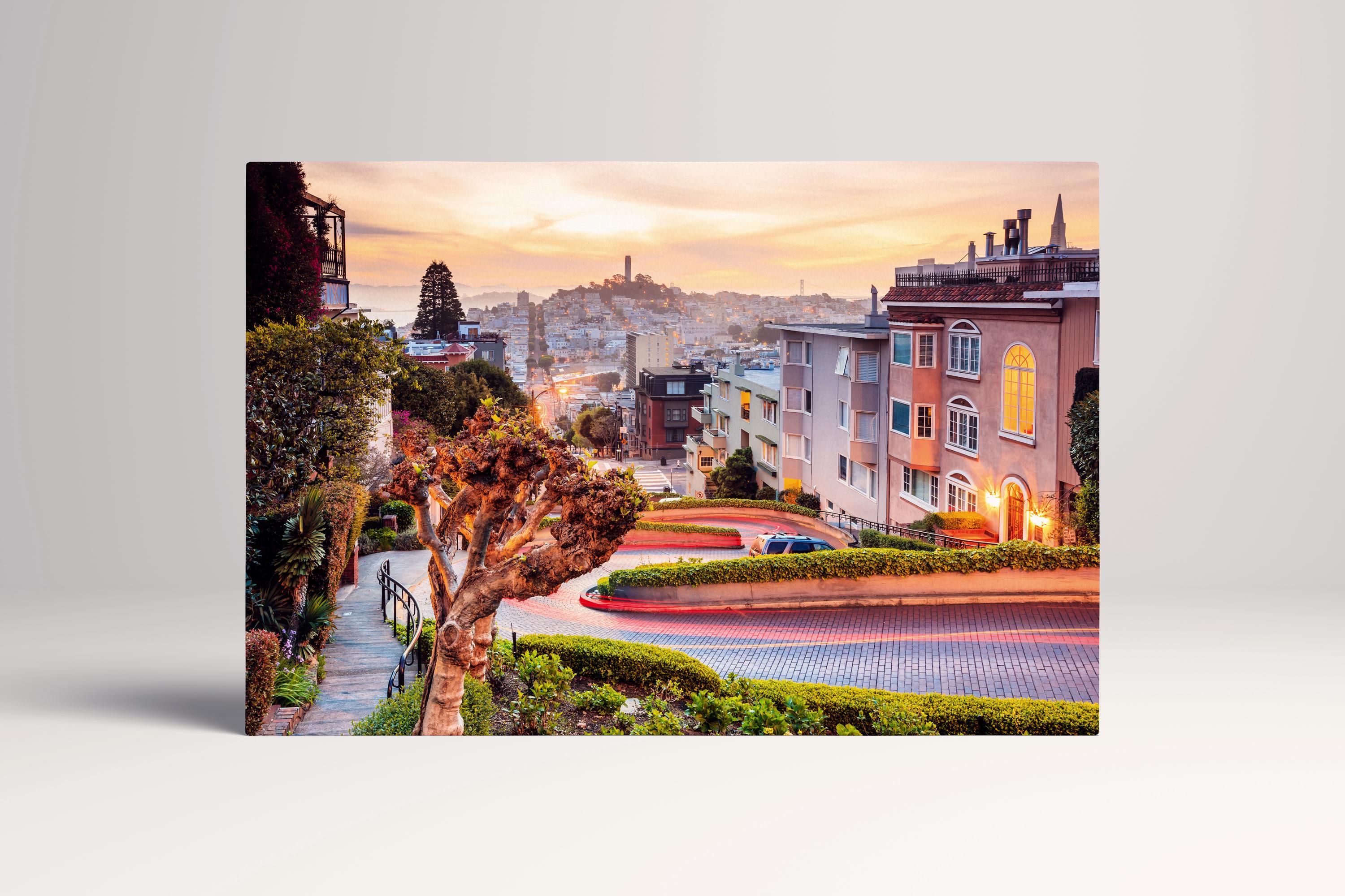 Capture the whimsical charm of the City by the Bay. This vibrant view of Lombard Street’s famous curves is printed on PETA Approved Eco Leather Canvas, where the colorful Victorian architecture and winding floral path are elevated by a luxury, textured finish. A high-energy statement piece that blends urban California style with modern, sustainable craftsmanship.