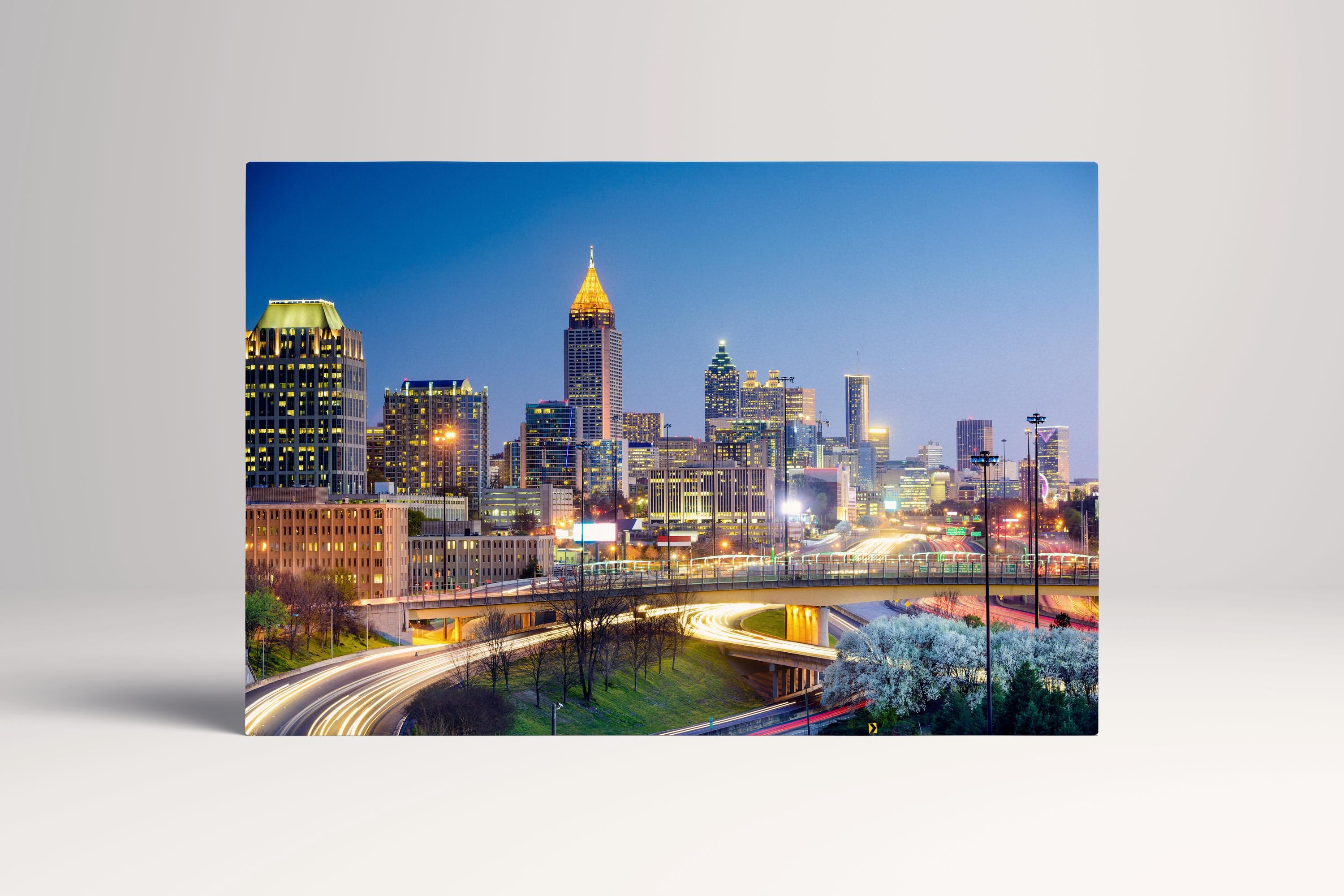 Celebrate the modern energy of the ATL. This sweeping view of the Atlanta skyline is printed on PETA Approved Eco Leather Canvas, where the soaring architecture and evening glow are elevated by a luxury, textured finish. A striking statement piece that blends Southern charm with modern, sustainable craftsmanship.