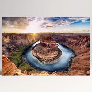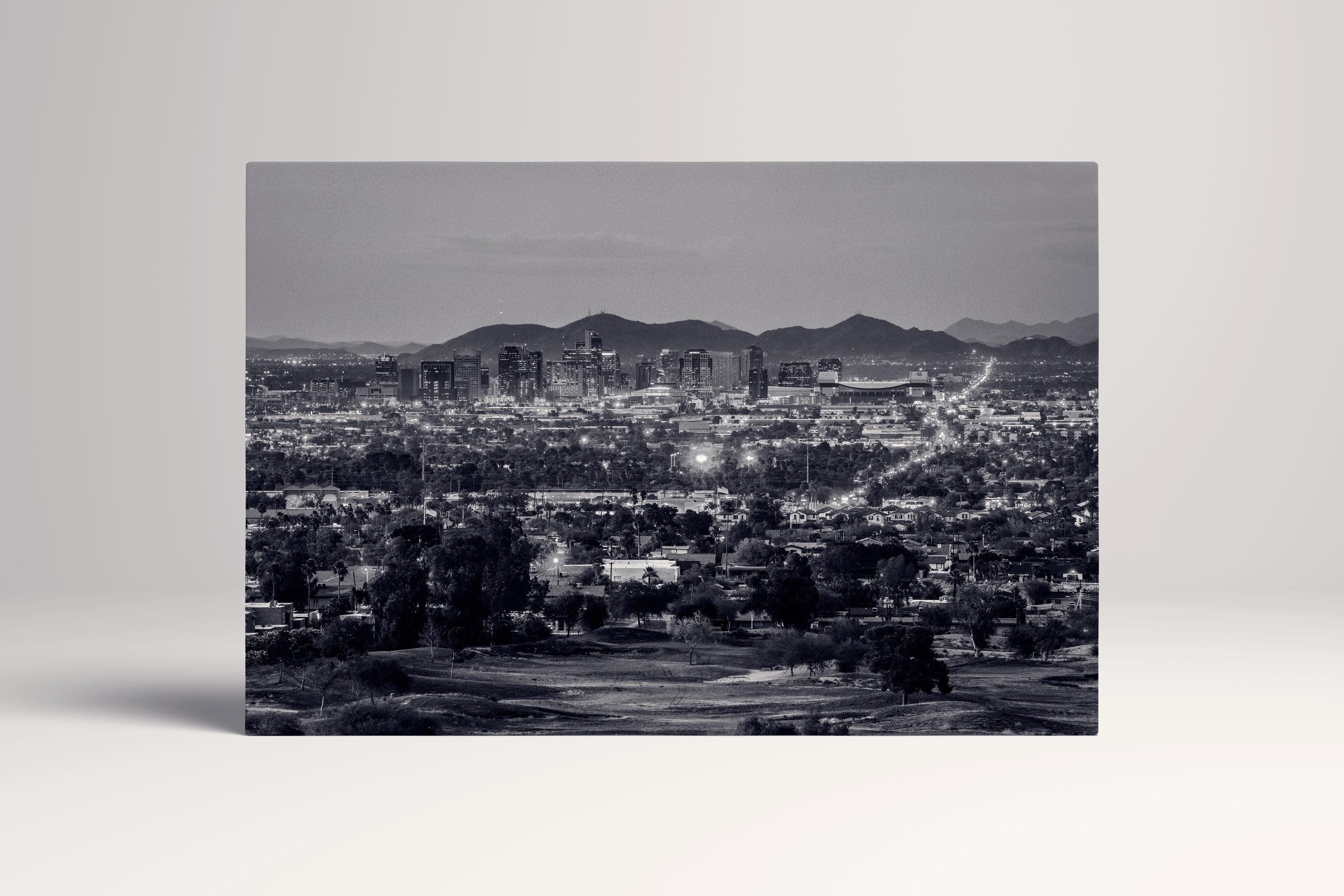 Bring the desert’s golden hour into your space with this stunning Phoenix skyline. Printed on PETA Approved Eco Leather Canvas, the deep purples and fiery oranges of the Arizona sunset are enhanced by a luxury, textured finish that adds a high-end feel to the city's modern architecture.