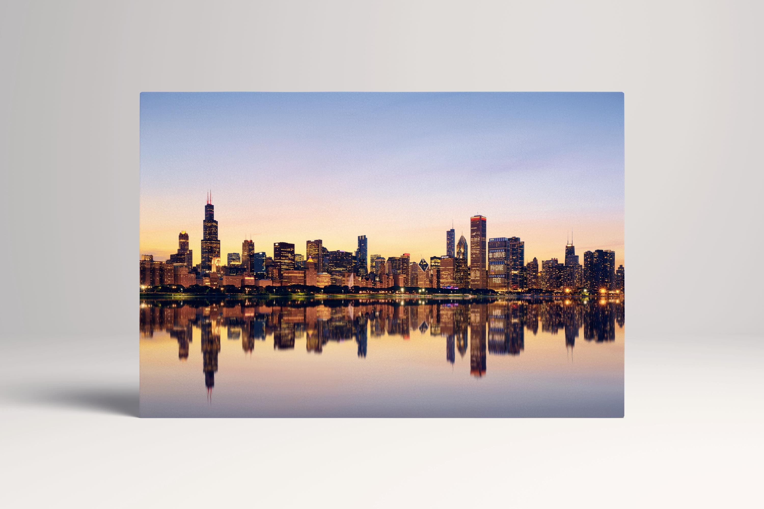 Capture the architectural majesty of the Windy City at twilight. This stunning Chicago skyline is printed on PETA Approved Eco Leather Canvas, where the glowing skyscrapers and deep blue waters of Lake Michigan are elevated by a luxury, textured finish. A high-impact statement piece that brings the energy of the Midwest to your home with modern, sustainable elegance.