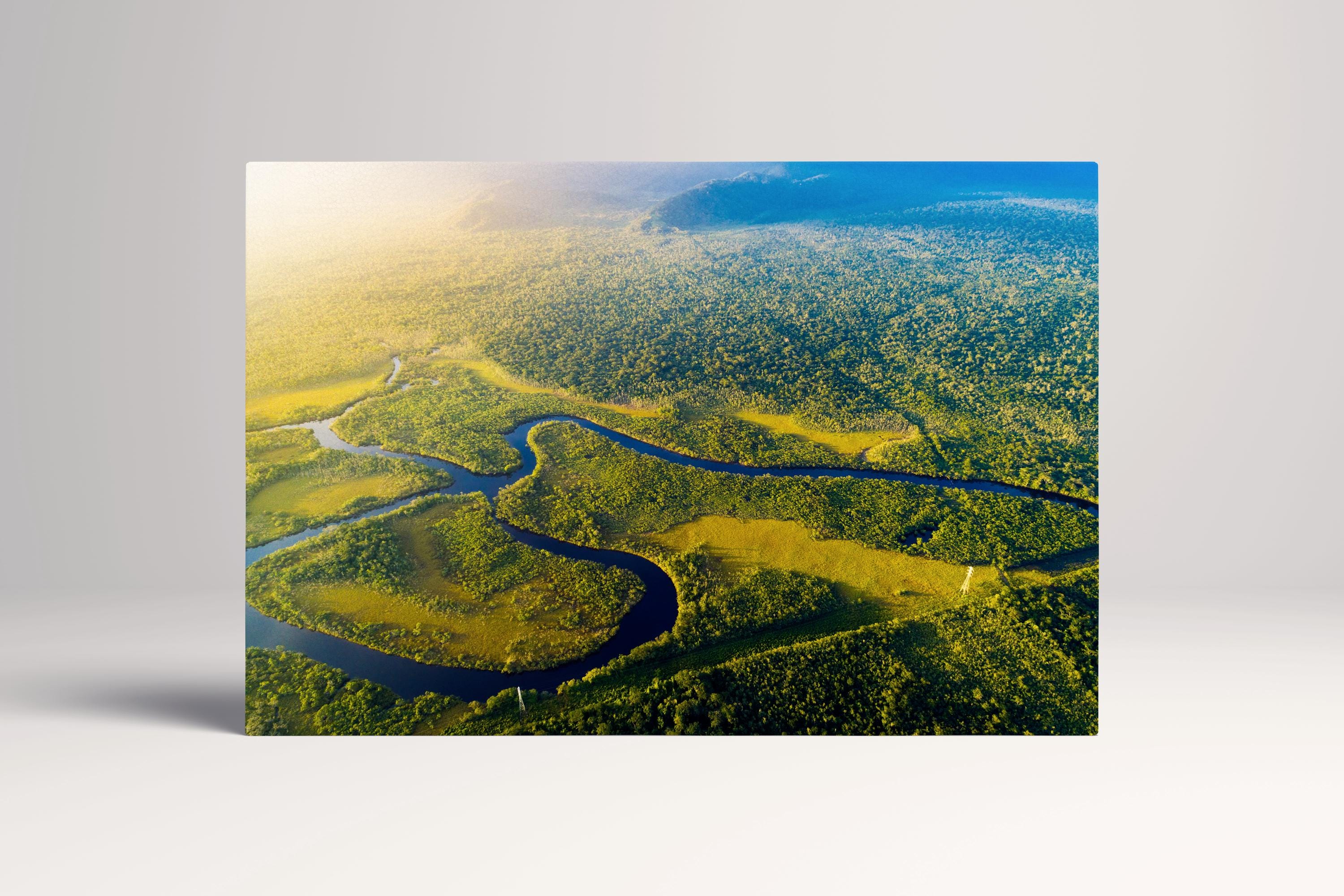 Immerse yourself in the vibrant heart of the Amazon. This stunning aerial perspective of the Manaus rainforest is printed on PETA Approved Eco Leather Canvas, where the infinite layers of green and the winding river are elevated by a luxury, textured finish. A powerful statement piece for nature lovers and those seeking a serene, biophilic atmosphere.